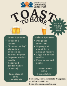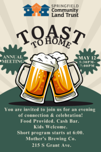 Join us for Toast to Home, SCLT’s annual meeting where neighbors, partners, and supporters come together to reflect on the past year and look ahead to Springfield’s housing future.